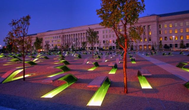 Наверное, самая фотографируемая табличка. За ней – здание Пентагона. Чуть левее – мемориал Пентагона. Сегодня, в пятнадцатилетие трагедии, побывал там. В честь 184 жертв было установлено 184 отделанных мрамором скамейки с именами. Под каждой скамьей находится открытый мини–бассейн с водой, подсвечиваемый в темное время суток.
