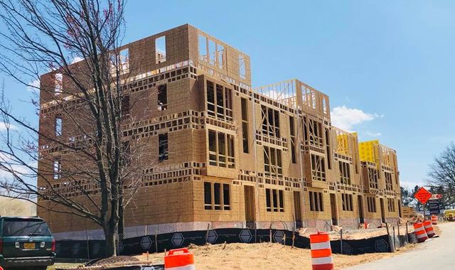Вот так у нас почти все дома и строятся. Дерево. Надо четыре этажа – да легко. Никаких тебе бетонных уровней. Насколько я понимаю, это ориентированно-стружечные плиты (OSB), продвинутый вариант фанеры.