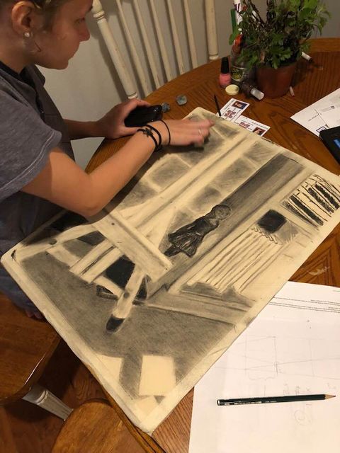 Лиза за работой. Осваивает уголь. В комментарии запощу фотку куска класса, с которой она это нарисовала