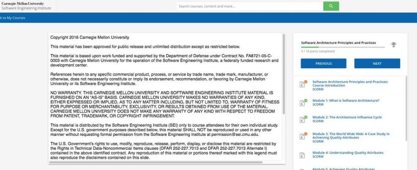 Кстати, про онлайн-обучение. Вот я сейчас купил курс, стоит он $500. Деньги я планирую вернуть, я участвую в программе, где при успешной сдаче экзаменов их возвращают. Но вот что интересно. Курс разработан на деньги Минобороны США, по сути, деятельность всего Solution Engineering Institute спонсируется из этого 411 млн. контракта. Курс интересный, но он абсолютно неинтерактивный. То есть, материал, созданный на деньги DoD, еще и продается. Это на самом деле к вопросу, насколько выгодно сейчас работать на рынке онлайн-образования, если делать качественный контент и найти правильных инвесторов.