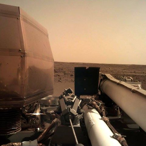 Фотография Марса с InSight. Выглядит как картонная коробка после дождя, склеенная скотчем. Это робот-геолог (точнее, ареолог, ведь это Марс), он теперь будет бурить пятиметровую дырку в этой пустыне и искать там ответы