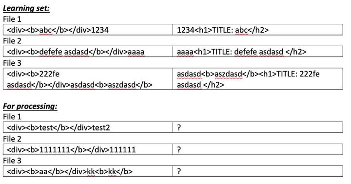 В training set у каждой пары A и B есть фрагменты, которые можно назвать “шаблоном”, и фрагменты, которые можно назвать “данными”. Например, заголовок статьи – данные, а обертка вокруг него – шаблон. После обработки N файлов система должна определить где данные, а где – шаблон, причем как в дизайне №1, так и в дизайне №2, а также уметь распознавать данные в файлах в дизайне №1 из for processing, и вставлять их в соответствующие места шаблона дизайна №2 для каждого из файлов for processing.