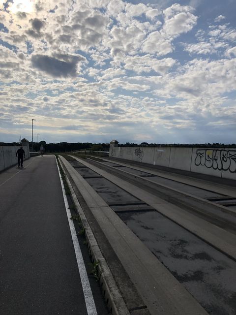 Здесь в Кембридже есть очень интересная автобусная трасса, guided bus route (к слову, самая длинная в мире такого типа). В ней интересно, что автобус встает как бы на рельсы, и дальше едет со скоростью около сотни практически без участия водителя (ему даже не нужно трогать руль). Фактически, это как трамвай или метро, только сильно проще по конструкции – ходят почти обычные автобусы (у них только сбоку есть подруливающее колесо). Плюс, в отличие от трамваев, они всегда могут работать в режиме обычного автобуса (что и происходит вне этого 25км участка).