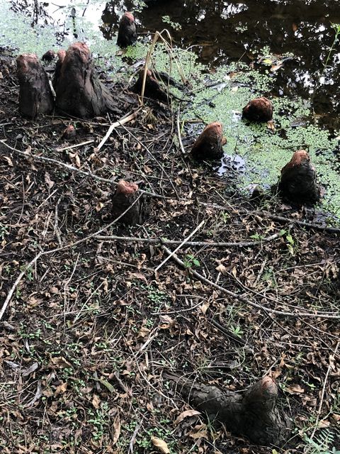 Это пневматофоры – растущие вверх дыхательные корни американского болотного кипариса (в данном случае). На верхушке они имеют мелкие отверстия, сквозь которые воздух проникает в воздухоносную систему таких корней. Воздухоностную – потому что эти корни внутри имеют полые воздуховоды. Корни болотных растений, типа этого кипариса, находятся в невыгодных условиях в смысле дыхания. Там в пропитанной водой почве происходят разного рода процессы брожения и гниения и кислород в самых верхних слоях почвы уже нацело поглощён, так что эволюция придумала добывать делать дополнительные дыхала у корней. Поэтому на болотах не может расти любое дерево, а вот такие приспособленцы с вертикальными корнями, добывающими воздух, могут.