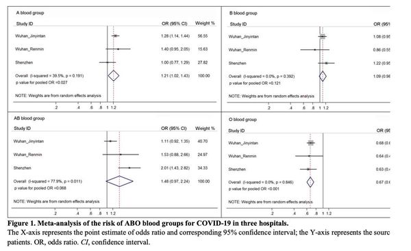 Интересная работа. Ученые предприняли попытку увидеть связь между группой крови и умершими от COVID. На небольших выборках из трех госпиталей есть несколько повышенный риск у обладателей второй группы (А), и сильно пониженный у обладателей первой группы (О). На мой взгляд, выводы делать еще рано, так как в двух из трех госпиталей объем выборки все-таки мал. Только из госпиталя в Ухани выборка стоящая потери времени на этот пост, но без перепроверки в других местах заявлять все равно рано еще. Там проанализировали группы крови 3694 жителей, получив 32.16%, 24.90%, 9.10% и 33.84% для групп A, B, AB and O. Из заболевших распределение 37.75%, 26.42%, 10.03% and 25.80% – выдаляются группы А (выше риск) и О (ниже риск). Далее они собрали данные с 206 умерших в том же госпитале. Получилось 41.26%, 24.27%, 9.22% и 25.24% – то есть, из умерших оказалось сильно больше среднего число людей с группой крови А (41.25 против 32.16) и сильно меньше среднего число людей с группой О (25.24 против 33.84).