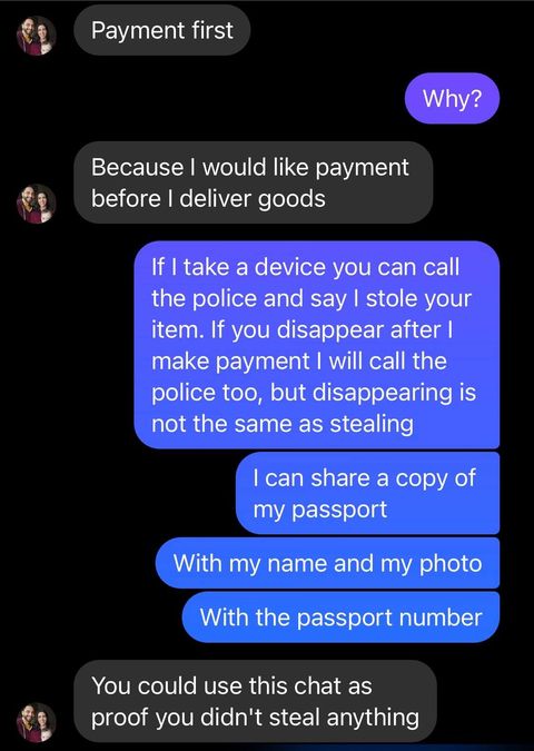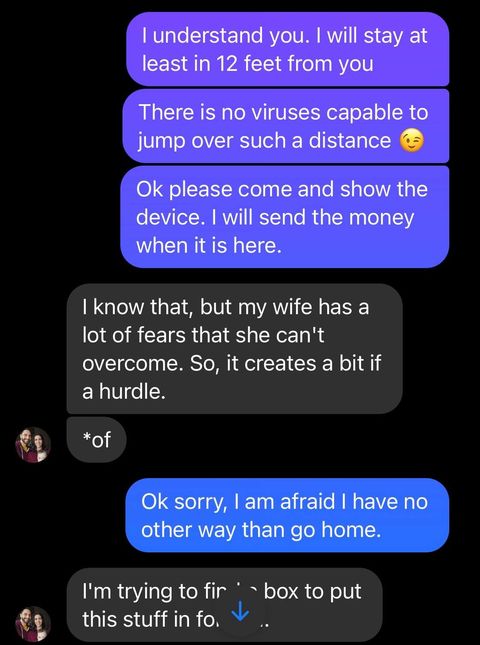 Вот не могу понять, это такой развод или чувак реально с такими огромными тараканами про ковид? Ведь технически он обмануть и не вынести девайс не может — я просто тут же вызываю к его дому полицию, показываю чат, перевод денег и дом хозяина, отказывающегося выносить проектор. Полиция так себе поможет, но перспектива разборок с полицией явно не нужна — если бы он хотел обмануть, он бы встретился не у своего дома. Он может вынести другой девайс, который не работает, а выглядит точно так же — это да, такая вероятность есть. Собственно, этот пункт я в своем сознании закрыть не мог, и потому уехал. С другой стороны, у товарища этого открытый фейсбук с семейными фотками, который он ведет довольно давно.