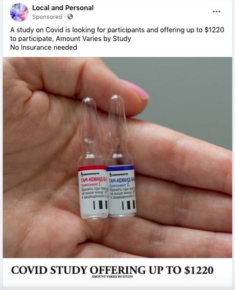 Наткнулся вот на такую любопытную рекламу. Компания набирает добровольцев на испытание вакцин от COVID, используя в рекламе фото ГАМ-КОВИД-ВАК от Гамалеи. Обещают платить до $1220. Я решил зарегистрироваться и посмотреть что будет дальше. Ответил на десяток стандартных вопросов и забронировал слот на видеозвонок – буквально на утро следующего дня.