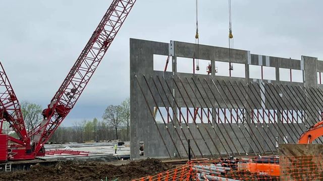 Строят то ли склад, то ли датацентр. Интересно, что сначала возводят стены, укрепляя их подпорками. При наших ветрах. Обратите внимание на масштаб – человечек внизу слева от стены