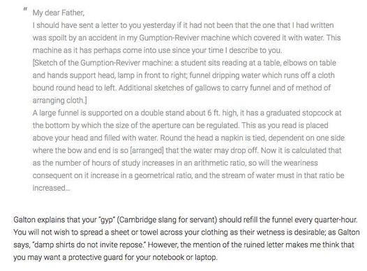Читаю запоем Циммера “Она смеётся как мать”. В 10 главе тут про Френсиса Гальтона: “…Чтобы лучше сосредотачиваться [изучая математику], он купил замысловатое устройство “Побудитель смекалки” (Gumption-Reviver), из которого на голову капала вода; слуга должен был пополнять его каждые 15 минут”. Гальтон писал, что ему учитель рекомендовал, так что похоже устройство было в ходу в Кемридже, чтобы не заснуть томными ночами. “Мы обычно начинали использовать эту штуку около десяти вечера, чтобы продержаться до часа или двух ночи; очень полезная была”, писал Гальтон.