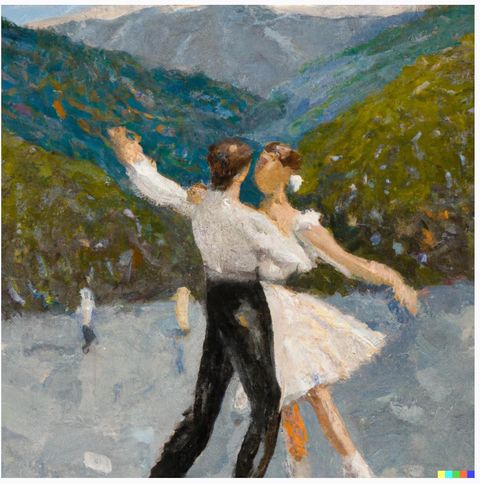 Также попросил DALL-E нарисовать картинку по фразе “an impressionist oil painting of a female figure skater dancing with her male partner, with the mountains and lakes as a back drop”, У меня как раз Маша сейчас катается в Lake Placid.