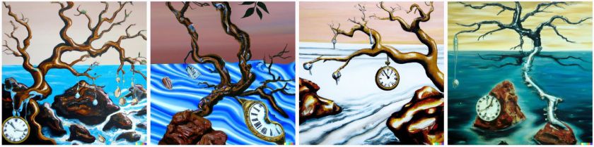 Еще две картинки сгенерированы по фразе “The painting depicts a scene with watches melting slowly on rocks and the branch of a tree, with the ocean as a back drop”. Я просто описал картину Сальвадора Дали, и DALL-E сделал свою версию.