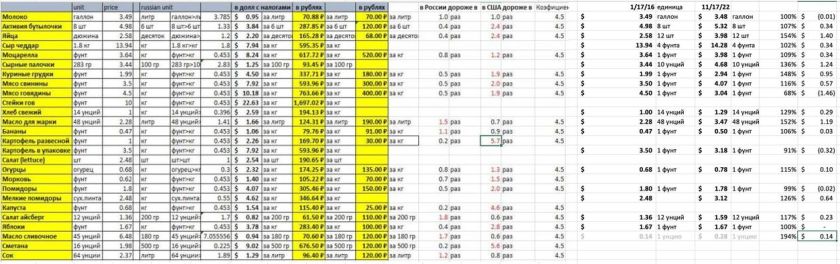 Я сразу по приезду в США, в 2016 году, прошелся по Волмарту и записал цены (левая половина таблички; от времени помутнела и местами пожелтела). Плохо записал, так как ни брендов не видно, ни качество не оценить. Ну как есть, так есть. Сегодня меня занесло в Волмарт опять, и я там нафоткал цены на тот же ассортимент.