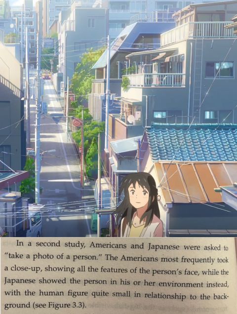 Читаю “The Culture Map”: …В другом исследовании американцев и японцев просили “сфотографировать человека”. Американцы чаще всего снимали людей с близкого расстояния, выявляя особенности человеческого лица, в то время как японцы вместо этого показывали человека в окружающем пространстве, когда человеческая фигура выглядела довольно маленькой по сравнению с задним планом.