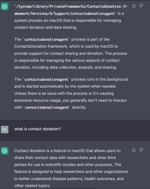 Или вот есть процесс contactsdonationagent. Если коротко, то система отсылает всякое разное с вашего компа для исследовательских целей, не только в apple, но через apple другим организациям. Возможно, это отключается через Share Mac Analytics в Privacy & Security.