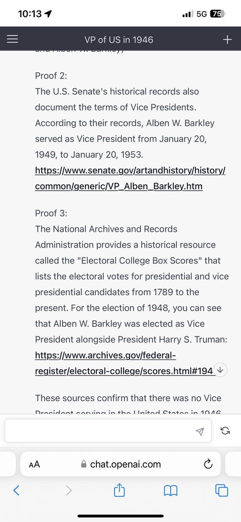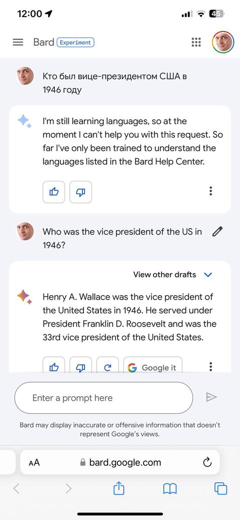 Пока гугловский Бард туповатенький по сравнению с GPT-4. Я спросил, кто был вице-президентом США в 1946.