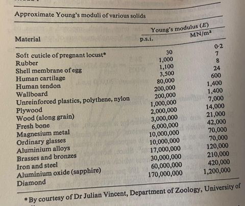 Читаю Structures by J.E.Gordon. Наиболее эластичным материалом у него является мягкая кутикула беременной саранчи. Она в 30 раз эластичнее резины. В тексте он ещё отмечает, что у мужских особей и саранч-девственниц он значительно более жёсткий. Кстати, графеновая пена, как я нагуглил, эластичнее этой кутикулы саранчи по одним данным ещё в 200 раз, а по другим – так вообще в 80000 раз (см коммент). Ее нет в таблице, потому что книга 1978 года, а графен получили недавно.