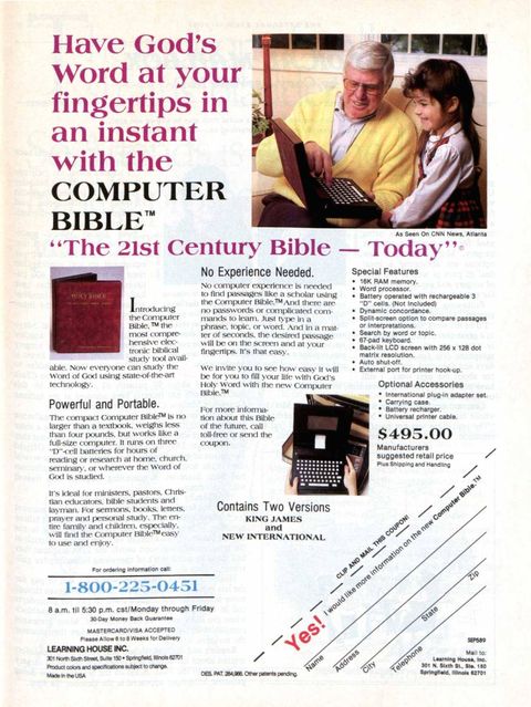 Продолжаю делиться рекламой из Saturday Evening Post. Я просто по вечерам just for fun делаю локальный поиск по журналу, и периодически пролистываю номера. Смотрите, реклама в журнале 1989 года — электронная библия со встроенным поиском. Экран 256х128, 16Кб памяти.