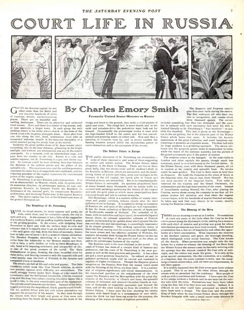 Вот еще одна статья-зарисовка про придворную жизнь в царской России от марта 1904 года. Статья авторства Чарльза Эмори Смита, который в 1890—1892 годах занимал пост посла США в России, а далее просто ей увлекался. Надо сказать, он довольно красиво описывает Питер.