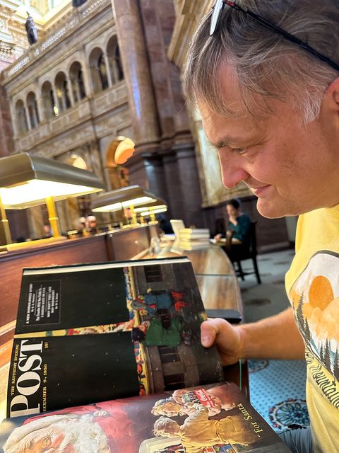 Сегодня — культурно-спортивная суббота. Мы с Надей взяли велики и поехали в крупнейшую библиотеку мира — Библиотеку Конгресса. Я в свое время интересовался Норманом Роквеллом, иллюстратором, работавшим в The Saturday Evening Post. Этот журнал издается с 1821 года по сегодняшний день. До 60-х годов прошлого века он издавался еженедельно. И вот мне было интересно полистать подшивки. В обычных библиотеках не нашлось, и вот мы с Надей записались в Библиотеку Конгресса. Теперь у нас там отдельный вход For Researchers. Надо сказать, что запись заняла 5 минут, и все, что нужно — это принести удостоверение личности и свое лицо на фотку.
