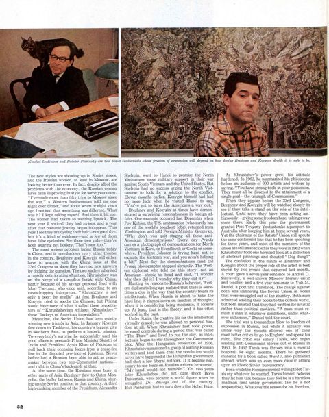 Когда они выступят перед 23-м съездом, Брежнева и Косыгина будут внимательно наблюдать, примут ли они позицию по роли интеллектуала. До сих пор они действовали двусмысленно — давая некоторую свободу здесь, отнимая ее там. В начале этого года правительство предоставило поэту Евгению Евтушенко паспорт в Австралию после нескольких лет домашнего ареста. Тем не менее, председатель Союза художников по-прежнему проводит ту же линию конформизма, которую он проводил уже три года, и большинство членов союза так же прикованы, как и в 1962 году, когда Хрущев с ужасом посмотрел на коллекцию абстрактных картин и закричал: “Это какое говно собачье это изобразило?”