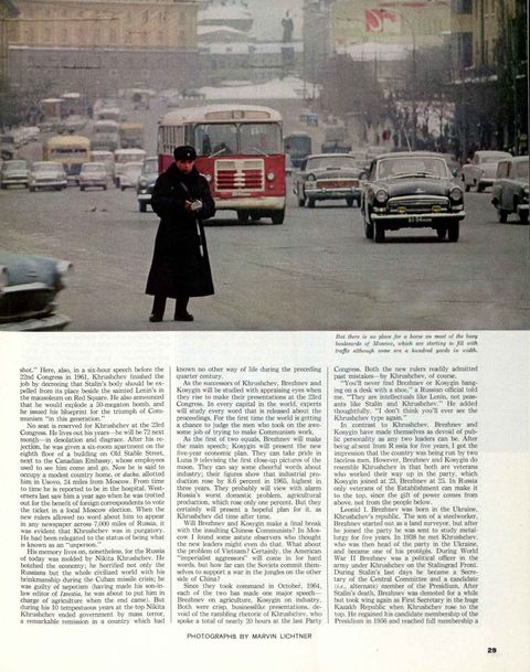 Один советский писатель, который пострадал от меняющегося суждения правительства о его работе, это короткий, совообразный человек по имени Владимир Дудинцев. Десять лет назад, во время “Оттепели”, он стал известным благодаря написанию романа “Не хлебом единым”, который был опубликован в журнале “Новый мир”. Несмотря на его литературную посредственность, роман вызвал сенсацию в России и за рубежом, потому что он осмелился изображать уныние и застой советской жизни. Однажды вечером Дудинцев рассказал мне, как его приветствовали на собрании Союза писателей. “Один за другим великие писатели хвалили мой роман”, — сказал он. “Это было удивительно”. Тогда началась реакция. Хрущев ругал писателя, но сказал: “Товарищ Дудинцев, при нашей помощи и его собственном желании, может найти правильный путь”. Дудинцев мог и сделал. Он написал пояснительное введение, и Хрущев разрешил публикацию ограниченного твердого издания. Теперь новый режим позволяет издание “Не хлебом единым”, и осенью Дудинцев опубликует второй роман “Неизвестный солдат”. “Разница между сейчас и десятью годами назад как небо и земля”, — сказал мне Дудинцев. “Я собираюсь устроить большую вечеринку”. Планы Дудинцева на вечеринку могут быть преждевременными. Никто не знает, какую линию будут проводить Брежнев и Косыгин к тому времени. Более того, кремлевологи задаются вопросом, сколько времени сами эти двое смогут удерживать власть, хотя пока не было никаких признаков какого-либо реального беспокойства. Ни один чиновник не проявил качеств сильного человека, которые русские ожидают от своего лидера В Кремле, как и в каждом правительстве, есть амбициозные молодые люди, которые, безусловно, надеются взять власть в свои руки в будущем.