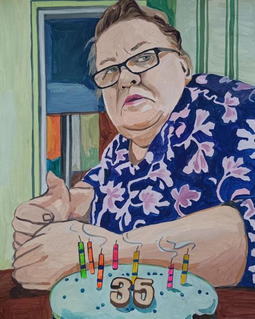 Елена Запрудских — художница, чьи работы отражают жизнь российской глубинки. Если стеб, то добрый. Вот первая картина с поварами называется «Мне том ям». Ну не прекрасно, а? А картина с тортиком «35» и подписью «Когда же ты съедешь?!» Там все хорошее
