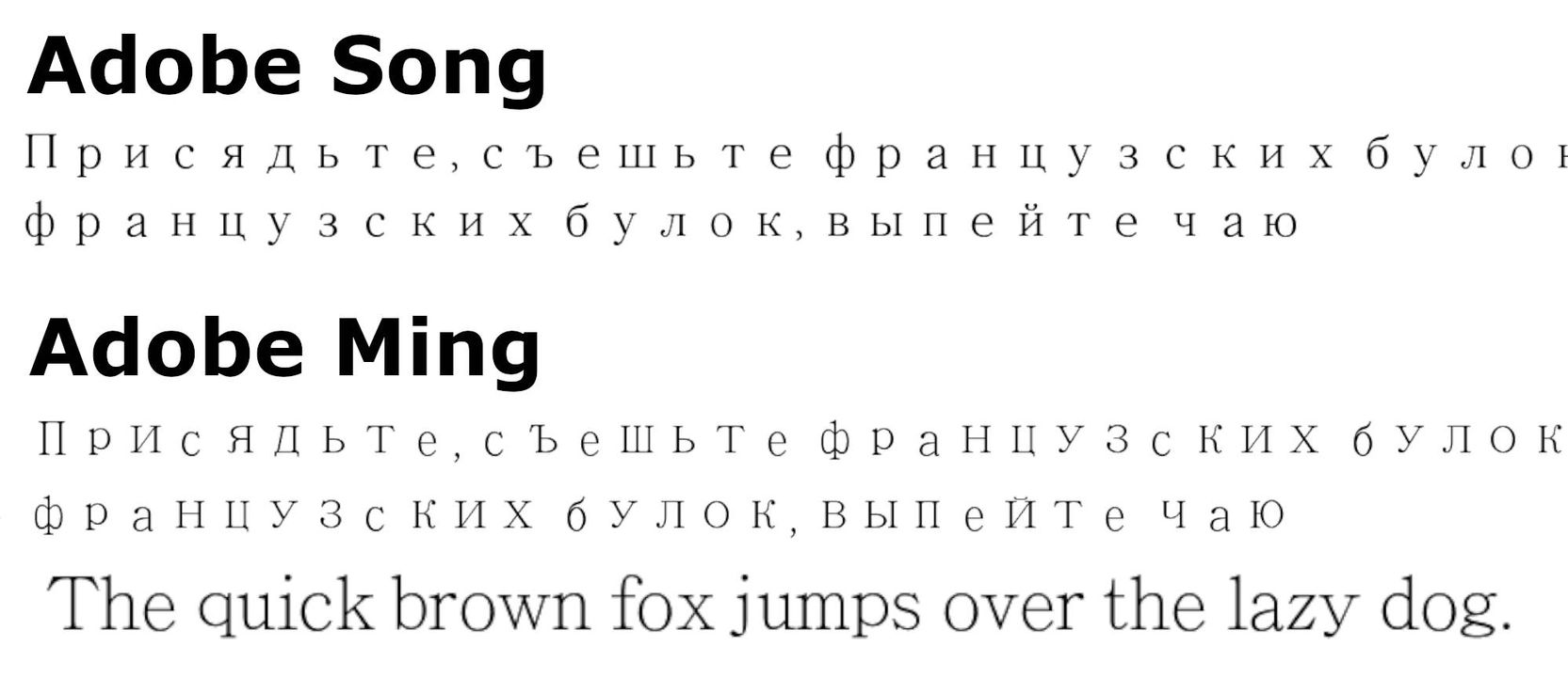 Оказалось, что виной всему Adobe и Microsoft. Они включили в свои пакеты очень криво нарисованные шрифты. И поскольку китайские символы там очень хорошего качества, шрифт используется повсеместно, а вот кириллица и даже латинница там «для галочки». Конкретно виновника три — Adobe Ming Std L, Adobe Myungjo Std M (он еще называется Adobe Ming), Adobe Song Std L. Самый «вирвиглазный» — это Adobe Ming. C латинницей там еще плюс-минус, а вот кириллицу, похоже, рисовали сами китайцы на заре становления компьютерных шрифтов и с той поры она не изменялась.