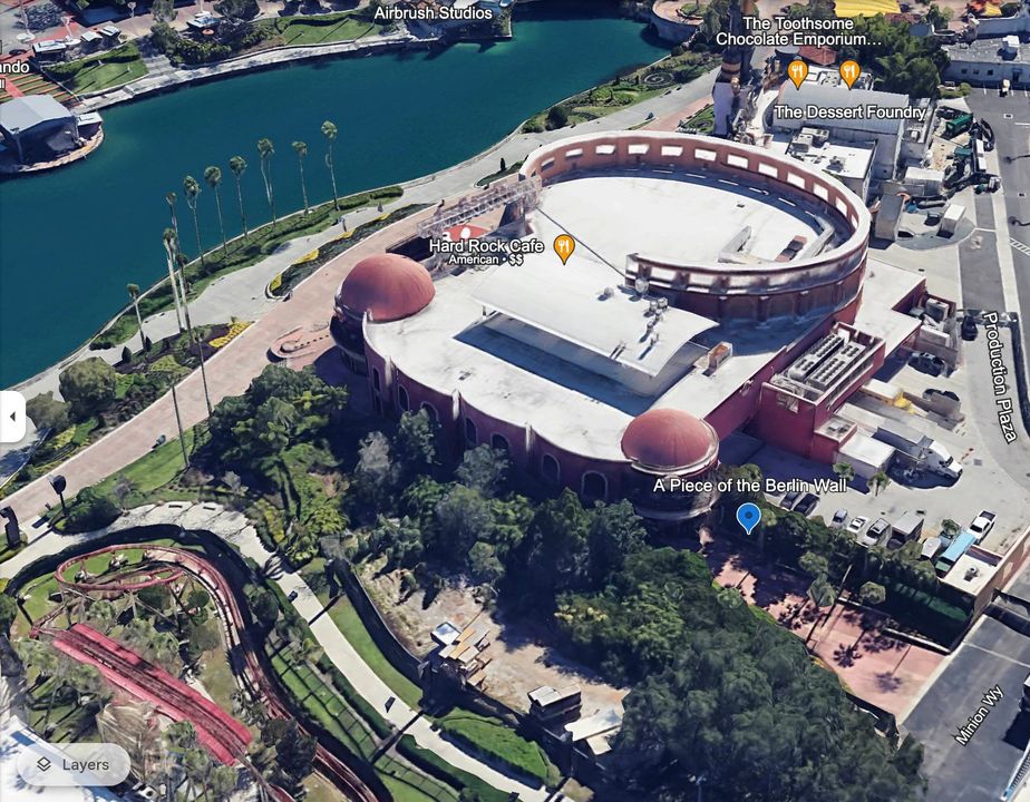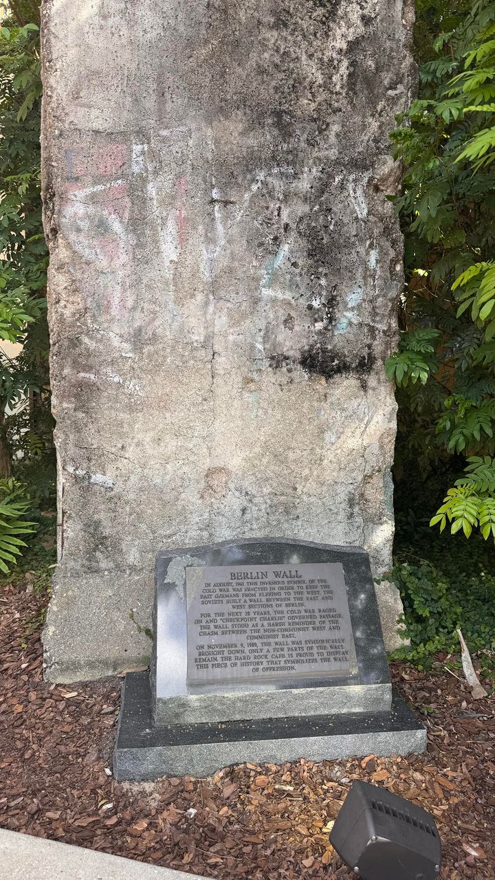 Кстати, я когда ездил в Орландо, я случайно нашел остатки берлинской стены на заднем дворе Hard Rock Cafe. На этот задний двор идет тропинка, но туда вообще никто не ходит, потому что там тупик. Вот если идти от набережной вдоль боковой стенки Hard Rock Cafe, то в итоге упрешься в забор Universal Park, и там же задний вход в Hard Rock Cafe — видимо, для групп из Universal Park (там в заборе есть ворота, которые для таких целей открываются). И вот там стоит спрятанный артефакт.