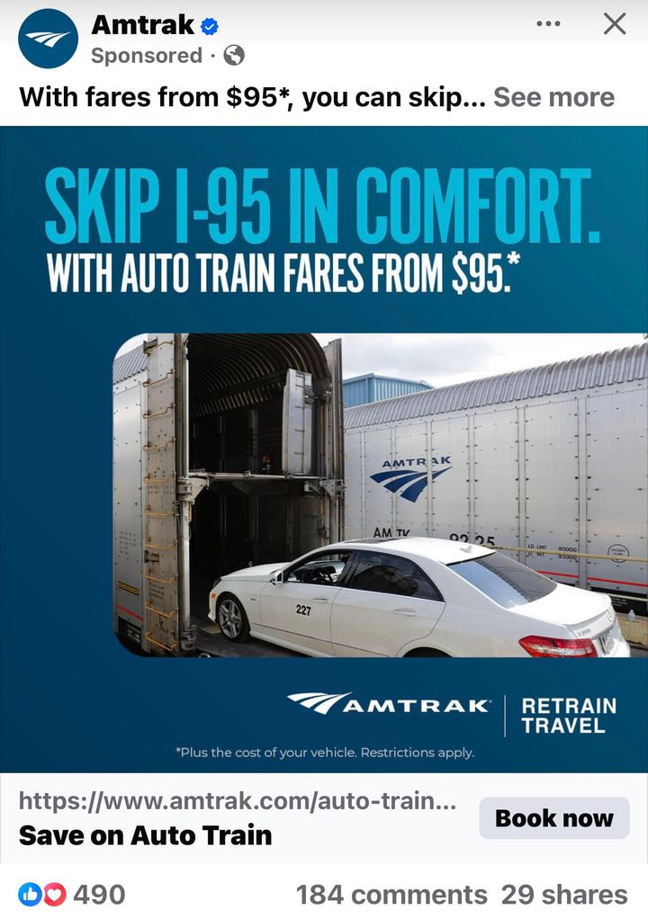 У нас Amtrak какое-то время назад придумал интересную бизнес-модель — путешествуй на поезде со своим авто — и мне теперь в фб рекламирует. Очевидно, это для тех, кому почему-то важно покататься в Маями именно на своей тачке, но пятнадцать часов ехать своим ходом туда не хочется.