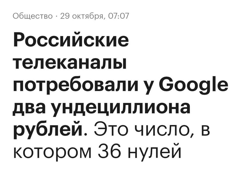 Российские телеканалы потребовали у Google два ундециллиона (2*10^36) рублей. Но меня улыбнуло другое — вообще-то Google, точнее Googol, обозначает 10^100. То есть, запас есть.