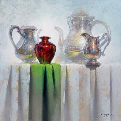 David Cheifetz. Американский художник. Основные темы — натюрморты, городские пейзажи и необычная портретная живопись с женскими моделями и разными насекомыми. Очень круто передана фактура материалов, и цвета прям здоровские. Надо тоже как-нибудь попробовать рисовать мастихином, я вообще пока не понимаю как это. В картинах Дэвида есть какое-то таинственное качество, часто освещаемое свечами. И интересный резонанс создается через контраст богато украшенных деталей с абстрактным фоном.