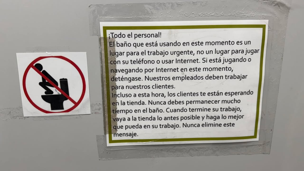 Туалет, который вы используете в данный момент, предназначен для срочных дел, а не для игр на телефоне или сидения в интернетах. Если вы сейчас играете или браузите интернет, прекратите. Наши сотрудники должны работать в магазине, а не засиживаться в туалете. Да, даже в это время клиенты ждут вас в магазине. Когда вы закончите, возвращайтесь в магазин как можно быстрее и делайте всё возможное на своей работе. И никогда не удаляйте это сообщение.