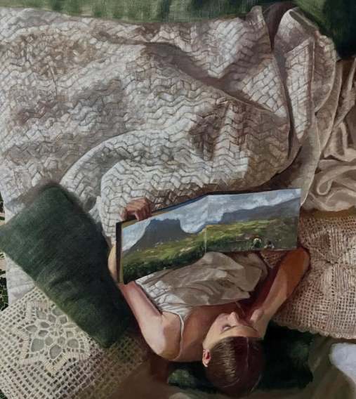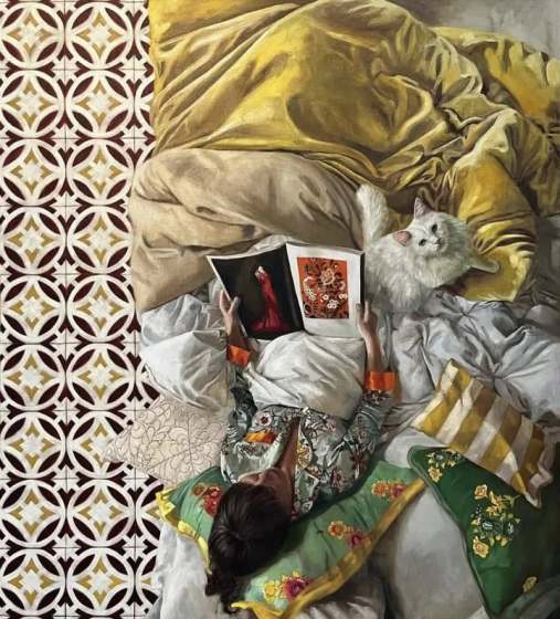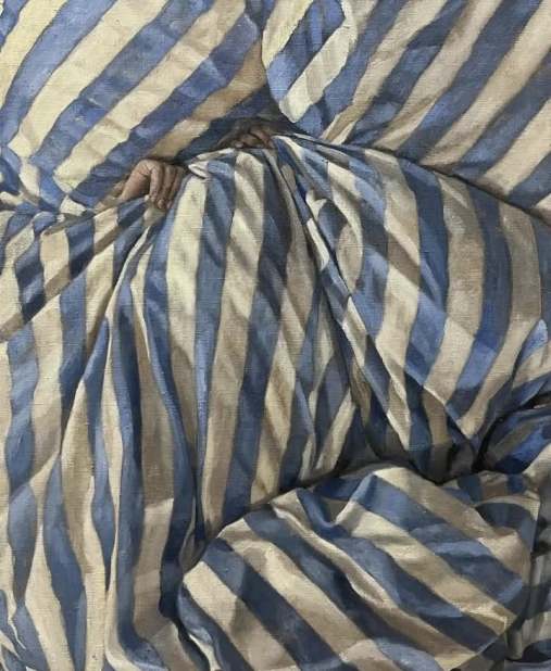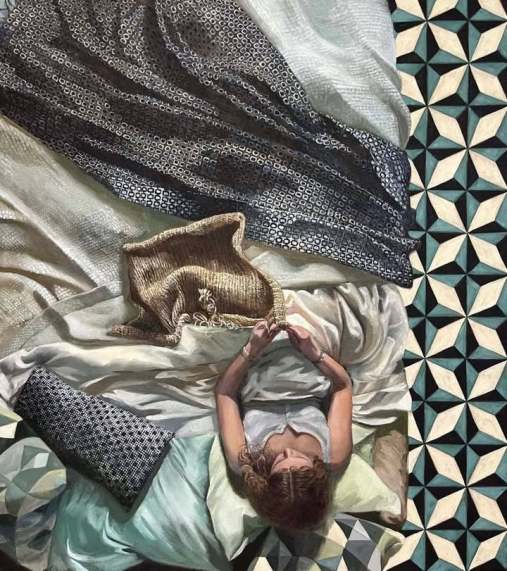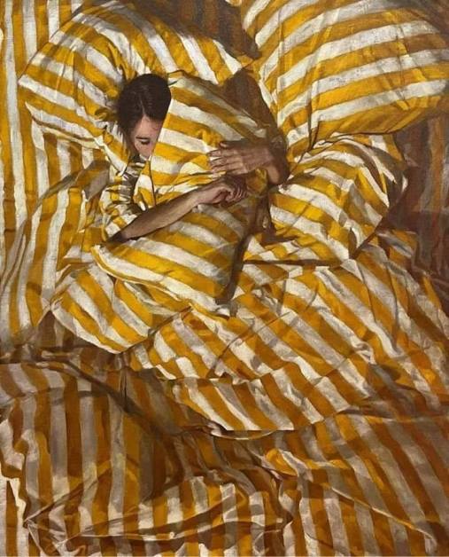 Интересная британская художница — Frances Featherstone. Она известна циклом работ «девушка в кровати под одеялом и стафф», где меняются девушки, одеяла и стафф. В более широком смысле ее работы совмещают переплетение людей и интерьеров с часто нетривиальной точки зрения. Вообще британские художники часто чуть-чуть сумасшедшие в хорошем смысле, влияние таких их коллег как Люциан Фрейд, Дэвид Хокни, Фрэнсис Бэкон явно не прошло мимо.