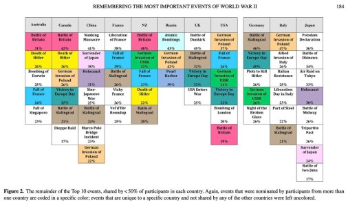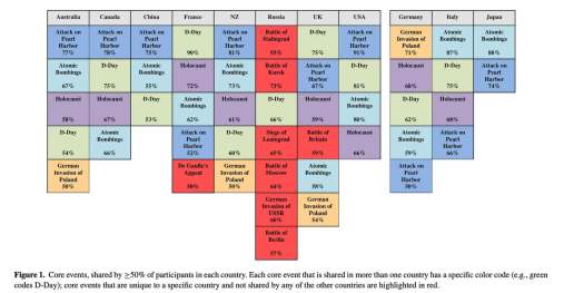 4 события получили статус «ключевых» (упомянуты более чем 50% респондентов): Атака на Пёрл-Харбор, Атомные бомбардировки Японии, Высадка в Нормандии, Холокост. Российский нарратив концентрируется на событиях, которые в советской и современной российской историографии называются Великой Отечественной войной (1941–1945). Россияне выделяли уникальные события: битвы под Сталинградом, Курском, Москвой, Берлином, блокаду Ленинграда. Таким образом, несмотря на то, что США и Россия сражались вместе как союзники, исследования показывают, что практически не существует пересечения в том, какие события запоминаются как наиболее важные. Члены каждой группы в основном помнили те события, которые были связаны с их собственной страной. Впрочем, это не удивительно.
