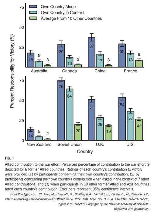 Однако, когда люди из каждой страны оценивали вклад других стран в войну, они приписывали США больший вклад, чем бывшему Советскому Союзу.