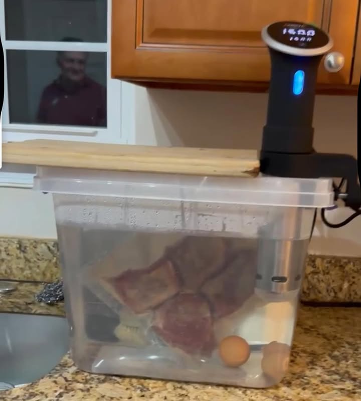 Ну вот, теперь и я добрался до сувида. В итоге, куханная электротехническая утварь, вовлеченная в готовку, стала включать электроскороварку Power Quick Pot, аэрогриль/айрфраер Ninja, слоукукер Crock-Pot, и вот теперь сувид Anova. Сделал первые стейки, получается круто, но в следующий раз вместо 150 F (65C) буду ставить 140F (60 C).