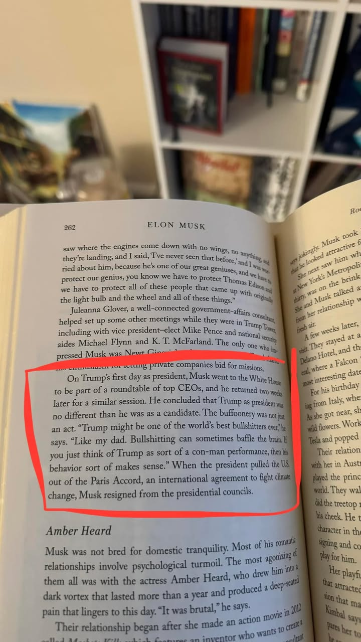 “…В первый день президентства Трампа Маск отправился в Белый дом, чтобы принять участие в круглом столе с ведущими генеральными директорами, а двумя неделями позже вернулся на подобную встречу. Он пришел к выводу, что Трамп в качестве президента ничем не отличался от Трампа-кандидата. Шутовство было не просто игрой. “Трамп, возможно, один из лучших болтунов в истории,” — говорит он. “Прямо как мой отец. Болтовня иногда может сбивать с толку. Если воспринимать Трампа как некое мошенническое представление, тогда его поведение приобретает смысл.” Когда президент вывел США из Парижского соглашения — международного договора по борьбе с изменением климата — Маск вышел из состава президентских советов.”