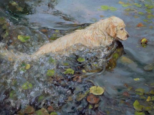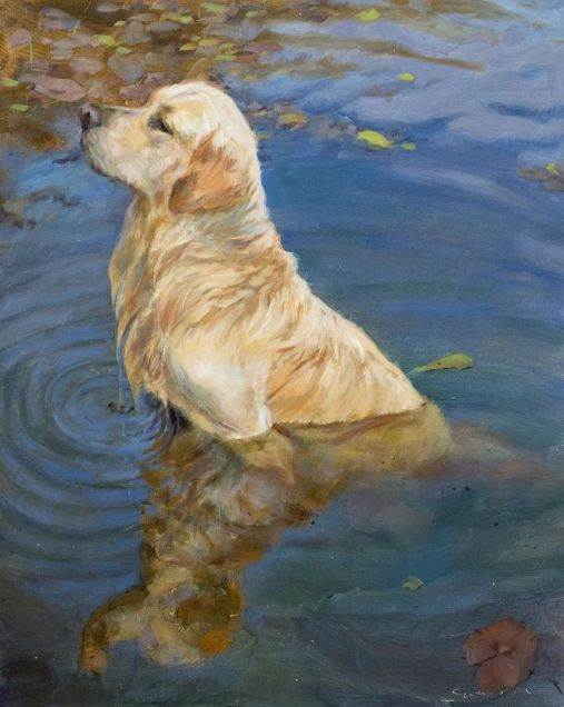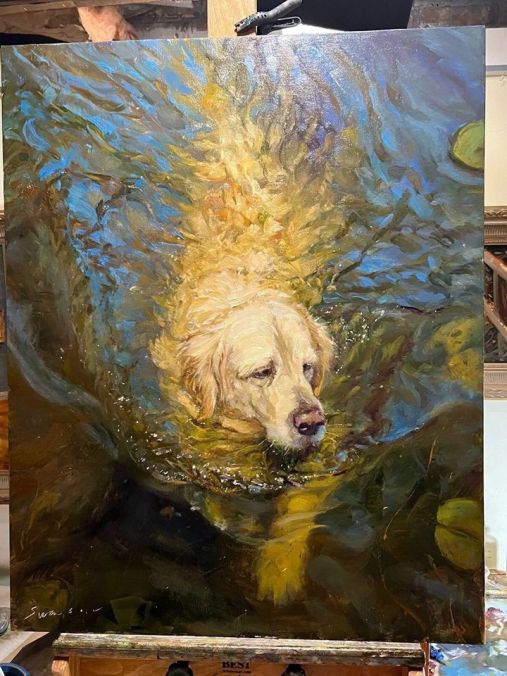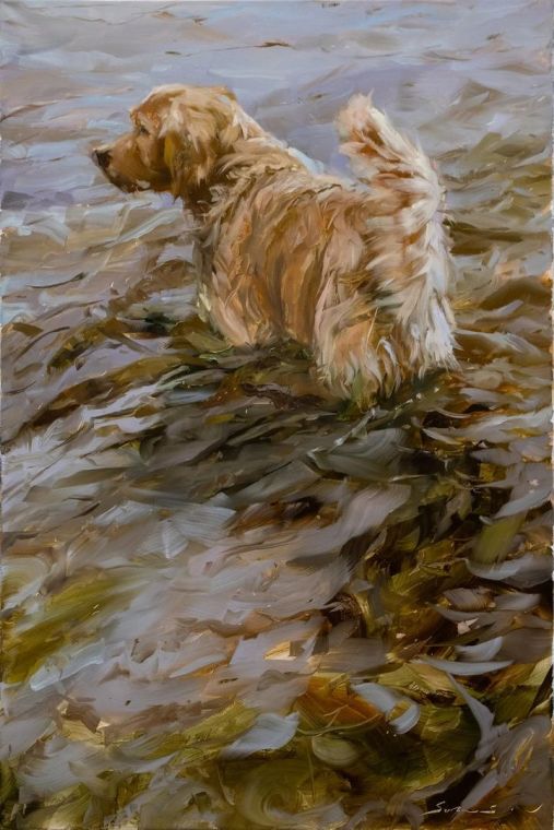 Художник Джеймс Свонсон родом из маленького городка в Висконсине. Жизнь вела его к карьере лесника, пока он не осознал, что рисовать деревья гораздо удобнее, чем сидеть на них. Его последний проект вызван уходом из жизни его собачки Amber. Джеймс решил в память о ней запустить цикл картин с собаками, по одной в день. В итоге он написал столько картин с мокрыми собаками, что теперь не собак писать уже наверное просто невыгодно. А между прочим, у него есть еще картина с жирафами.