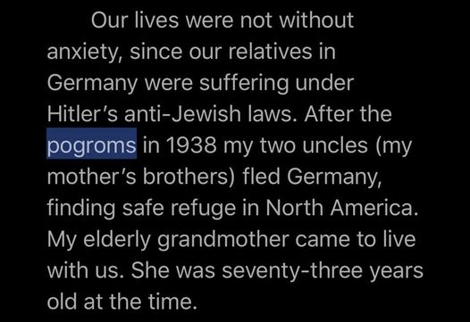 Читаю Анну Франк, и с удивлением для себя обнаружил, что русское слово погром (pogrom) вошло в английский, немецкий и другие европейские языки как обозначение массовых нападений на места компактного проживания евреев. Это уже потом оно стало употребляться в более широком смысле. В тексте Анна вспоминает еврейские погромы, известные как Хрустальная ночь.