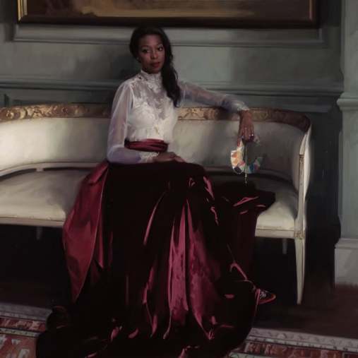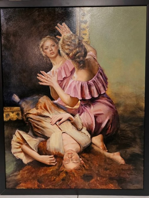 Я пытался копнуть глубже, но так и не нашел никаких достоверных подтверждений ни имени художника, ни названия картины. Очень возможно, это AI художество — на это указывает странная анатомия руки (локтя и предплечья) женщины.