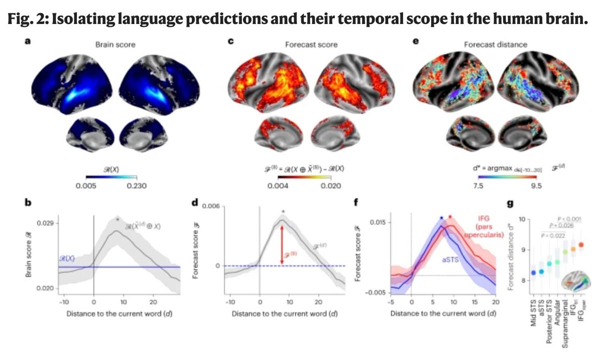 Короче, о чем там. Мозг работает не только на предсказание следующего слова, но как бы запускается несколько процессов разного «разрешения». Височная кора (низший уровень) предсказывает краткосрочные и локальные элементы (звуки, слова). Лобная и теменная кора (высший уровень) предсказывает долгосрочные и глобальные языковые структуры. Семантические прогнозы (смысл слов и фраз) охватывают более длительные временные интервалы (≈8 слов вперёд). Синтаксические прогнозы (грамматическая структура) имеют более короткий временной горизонт (≈5 слов вперёд).